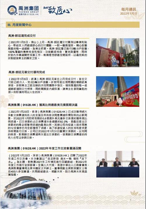 1月20日,禹洲集團5.8億美元境外美元債券交換要約獲得高比例通過,82%本金總額已獲交換,是最近提出交換要約的房企里獲得通過的最高比例,力證持有人對禹洲實力的信心及肯定。同時其余公司向投資人征求同意的12支票據(jù)也均全部獲得了通過,再次彰顯投資人對禹洲未來發(fā)展的期待及信任。為了感謝投資人的支持和提供更多時間進行交換,本公司已于2022年1月31日重開交換要約,以相同的條款,對剩余交換票據(jù)再次提出交換要約,使剩余交換票據(jù)的持有人也可以參與交換。