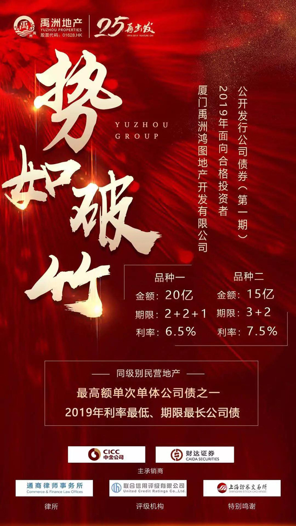 4月2日,禹洲地產(chǎn)全資子公司廈門禹洲鴻圖地產(chǎn)開發(fā)有限公司成功發(fā)行人民幣35億元的公司債券。本次債券發(fā)行連破兩項(xiàng)紀(jì)錄,分別是“AA+”民營地產(chǎn)企業(yè)最高額單次單體公司債之一,以及2019年“AA+”民營地產(chǎn)企業(yè)利率最低、期限最長公司債。反映了投資者對(duì)公司營運(yùn)表現(xiàn)的肯定、財(cái)務(wù)狀況的認(rèn)可及未來發(fā)展前景的信心。