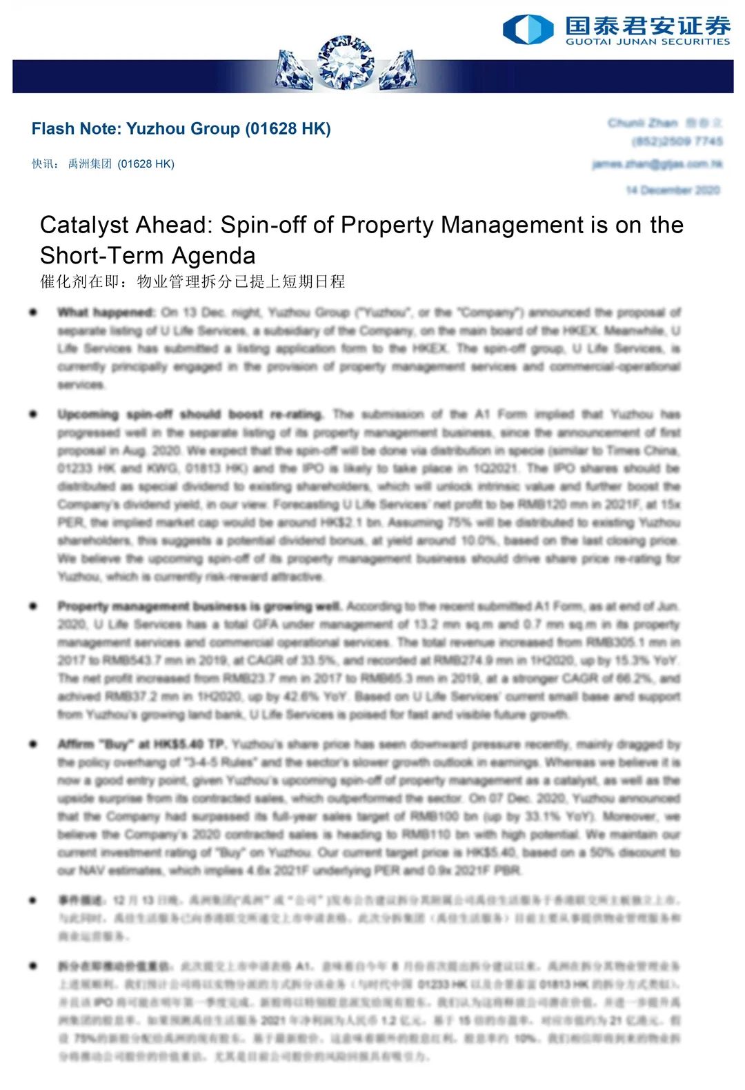 今日,國(guó)際著名投行國(guó)泰君安國(guó)際發(fā)布研究報(bào)告指出,于12月13日晚,禹洲集團(tuán)(01628.HK)發(fā)布公告建議拆分其附屬公司禹佳生活服務(wù)于香港聯(lián)交所主板獨(dú)立上市。與此同時(shí),禹佳生活服務(wù)已向香港聯(lián)交所遞交上市申請(qǐng)表格。