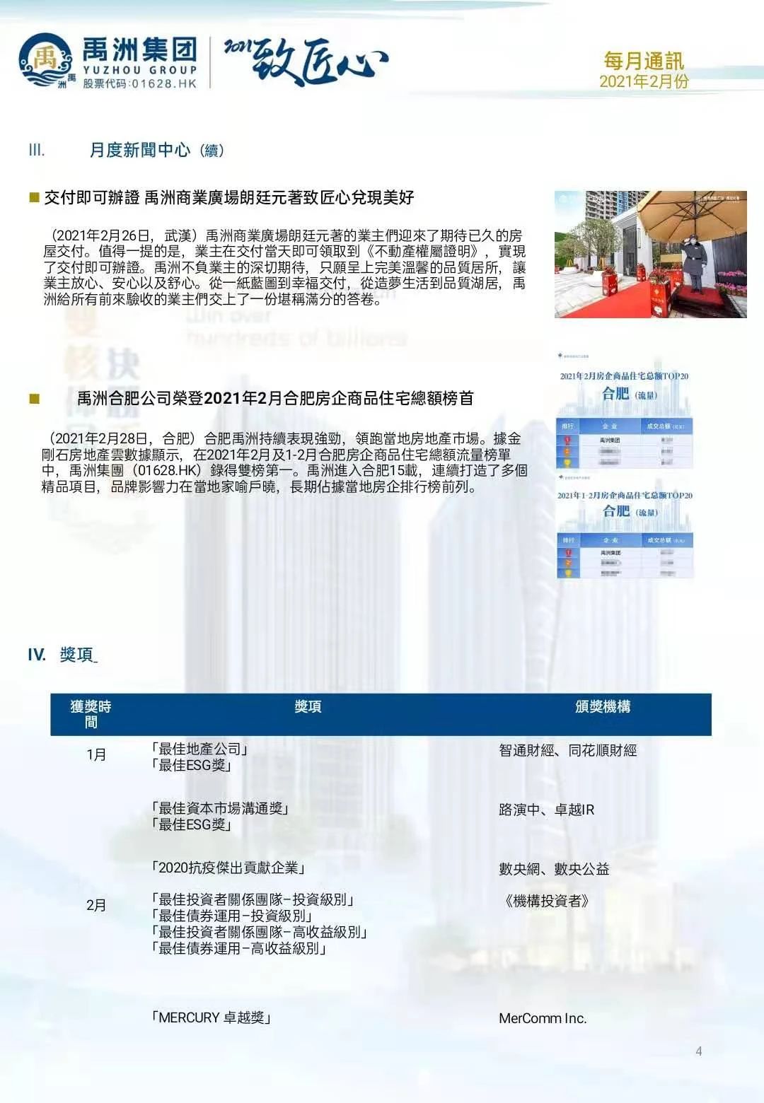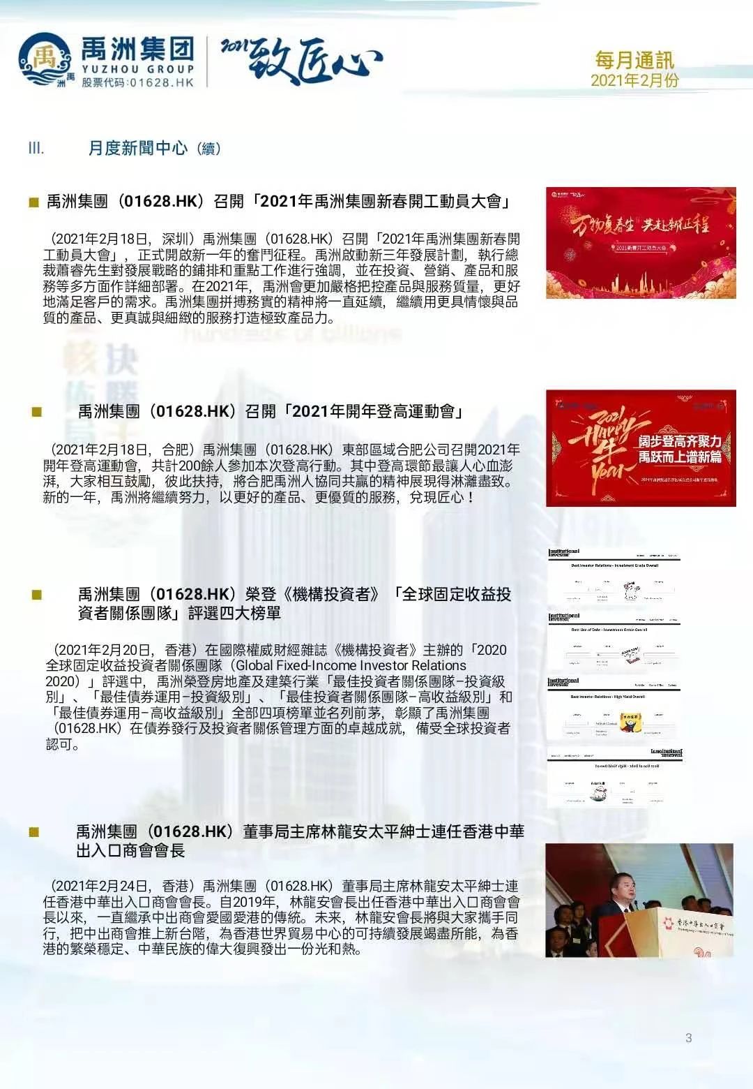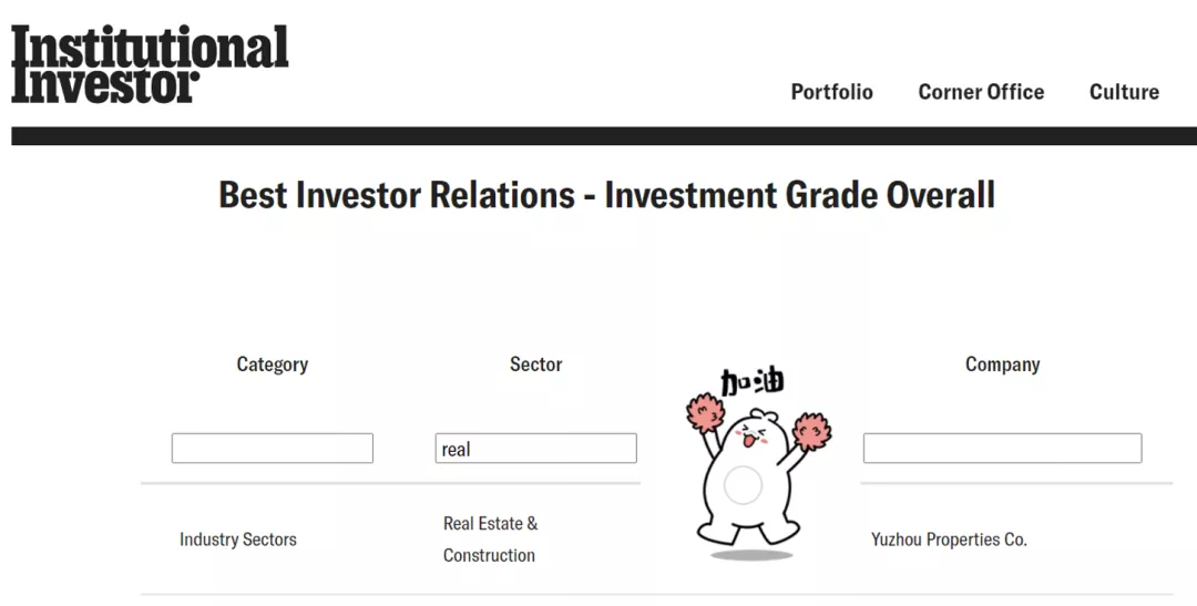 一直以來,禹洲集團(tuán)致力維護(hù)與資本市場關(guān)系,重視股東回報,其積極表現(xiàn)屢獲行業(yè)高度認(rèn)可。近日,在國際權(quán)威財經(jīng)雜志《機(jī)構(gòu)投資者》主辦的“2020全球固定收益投資者關(guān)系團(tuán)隊(duì)(Global Fixed-Income Investor Relations 2020)”評選中,禹洲集團(tuán)榮登房地產(chǎn)及建筑行業(yè)“最佳投資者關(guān)系團(tuán)隊(duì)–投資級別”、“最佳債券運(yùn)用–投資級別”、“最佳投資者關(guān)系團(tuán)隊(duì)–高收益級別”和“最佳債券運(yùn)用–高收益級別”全部四項(xiàng)榜單并名列前茅,彰顯了禹洲集團(tuán)在債券發(fā)行及投資者關(guān)系管理方面的卓越成就,備受全球投資者認(rèn)可。