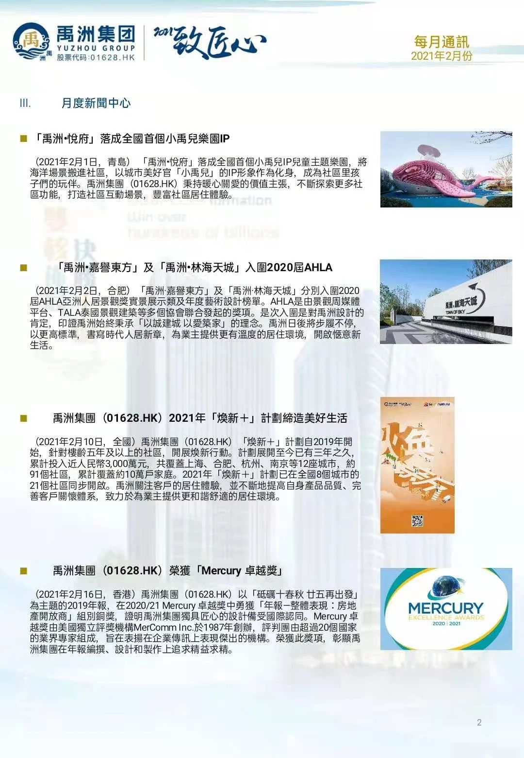 此外,禹洲集團(tuán)以“砥礪十春秋 廿五再出發(fā)”為主題的2019年報,在2020/21 Mercury Awards年報封面設(shè)計大獎中勇獲“年報—整體表現(xiàn):房地產(chǎn)開放商”組別銅獎,證明禹洲集團(tuán)獨(dú)具匠心的設(shè)計備受國際認(rèn)同。MERCURY Awards由美國獨(dú)立評獎機(jī)構(gòu)MerComm Inc.于1987年創(chuàng)辦,評判團(tuán)由超過20個國家的業(yè)界專家組成,旨在表揚(yáng)在企業(yè)傳播上表現(xiàn)杰出的機(jī)構(gòu)。榮獲此獎項(xiàng),彰顯禹洲集團(tuán)在年報編撰、設(shè)計和制作上追求精益求精。