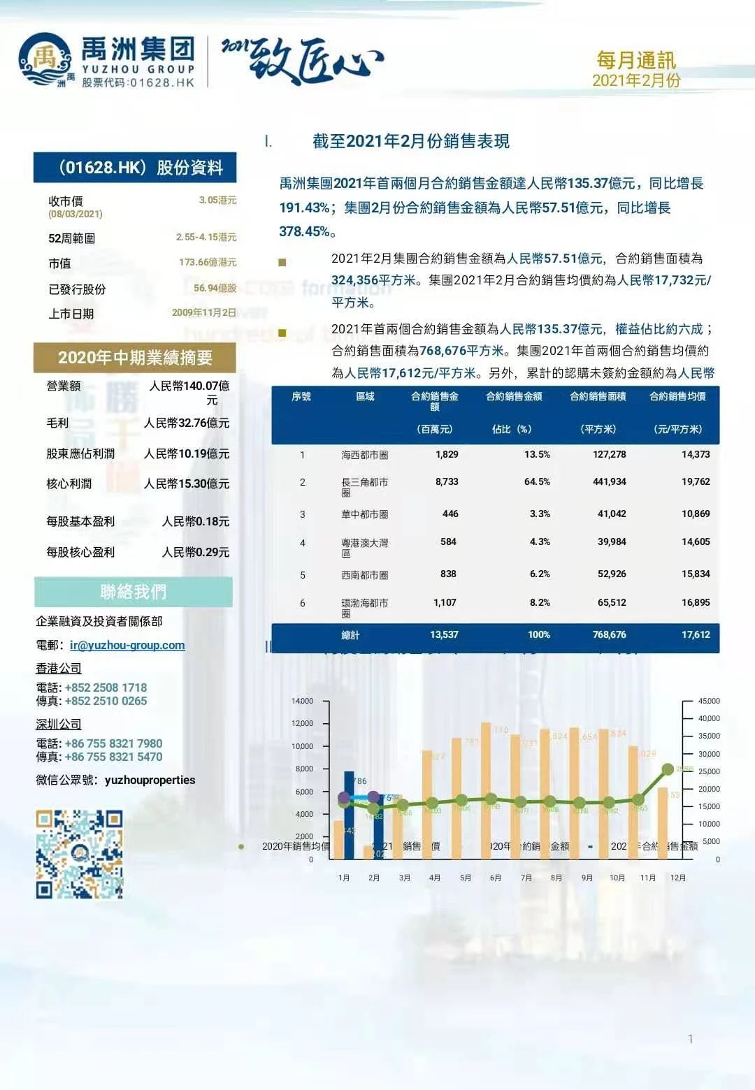 2021年2月,禹洲集團(tuán)實(shí)現(xiàn)合約銷售金額為人民幣57.51億元,同比增長378.45%,合約銷售面積為324,356平方米,合約銷售均價約為人民幣17,732元/平方米。