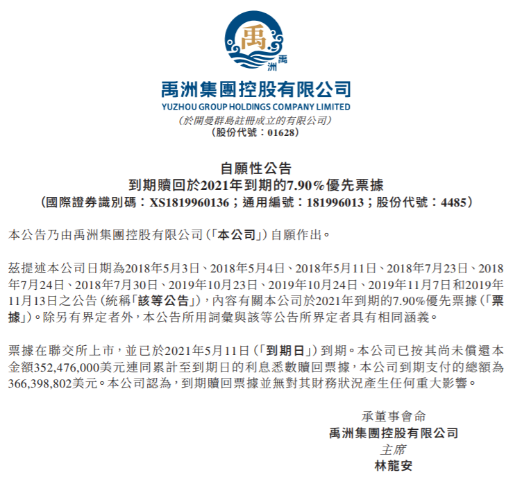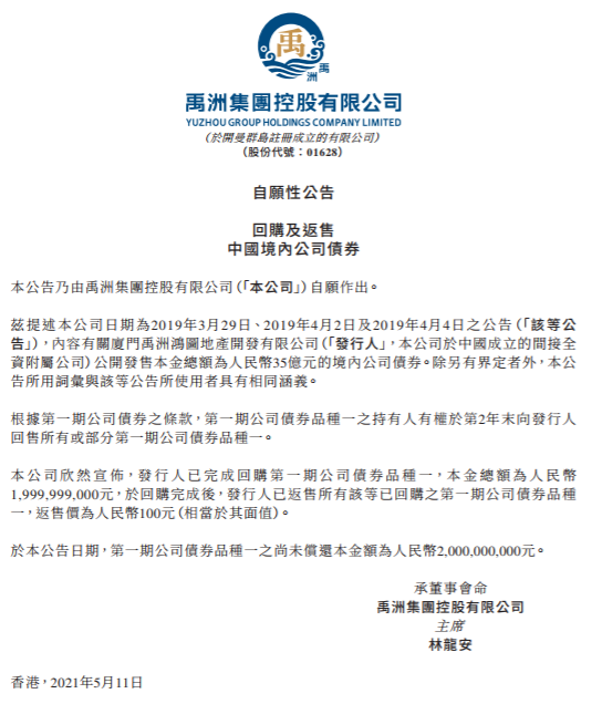 5月11日,禹洲集團(tuán)(01628.HK)宣布,本公司已按時(shí)贖回2021年5月到期的3.52億美元7.90%優(yōu)先票據(jù)。連同今年3月初,禹洲按時(shí)贖回2021年3月到期的3.2億美元優(yōu)先票據(jù),禹洲已悉數(shù)贖回今年內(nèi)到期的所有境外優(yōu)先票據(jù)。