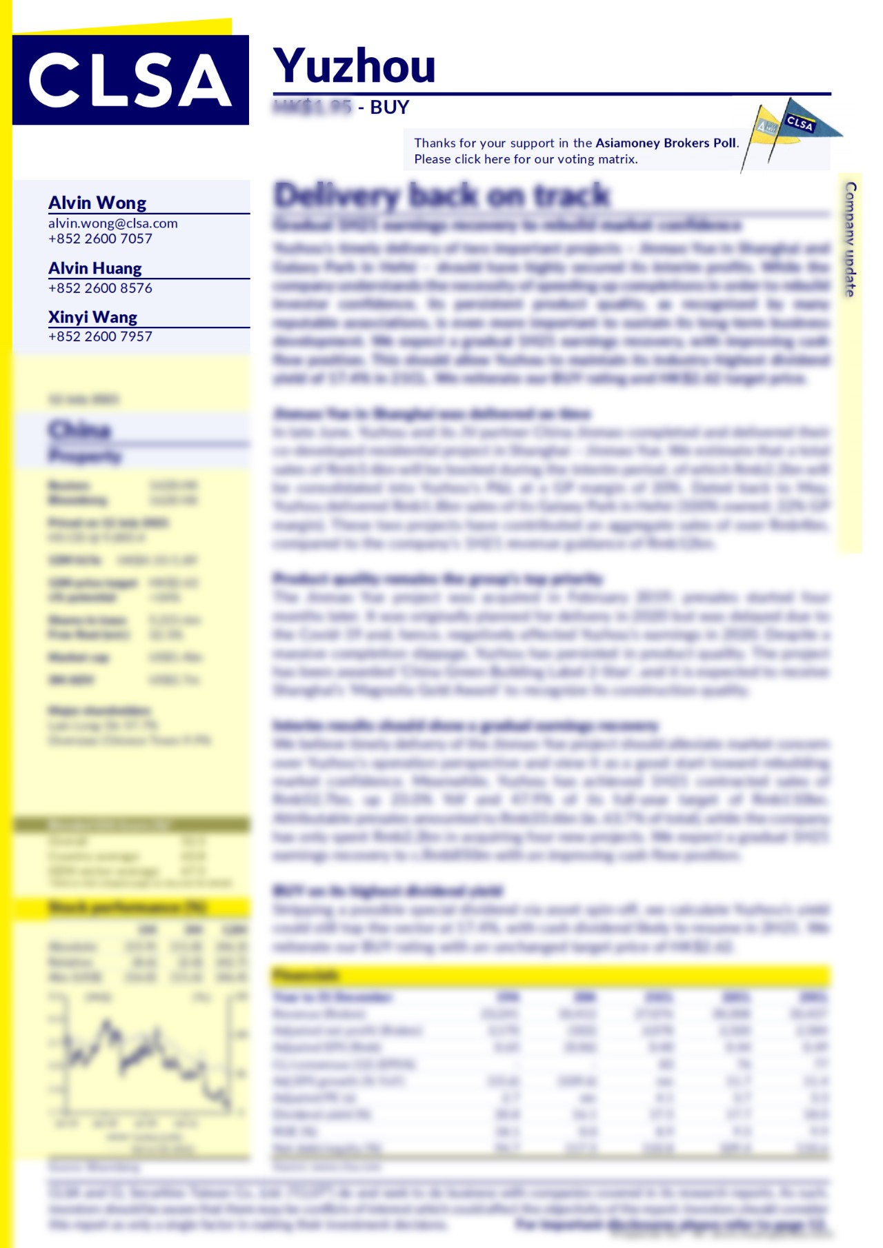 研報(bào)指出,禹洲集團(tuán)計(jì)劃分拆其物管商管業(yè)務(wù),有望帶來(lái)特別股息,即使扣除這一部分,禹洲的股息收益率仍可達(dá)到17.4%,領(lǐng)先行業(yè)水平。此外,其現(xiàn)金派息也有望在2021年下半年恢復(fù)。中信里昂看好禹洲未來(lái)發(fā)展,重申“買入”評(píng)級(jí),目標(biāo)價(jià)2.62港元。