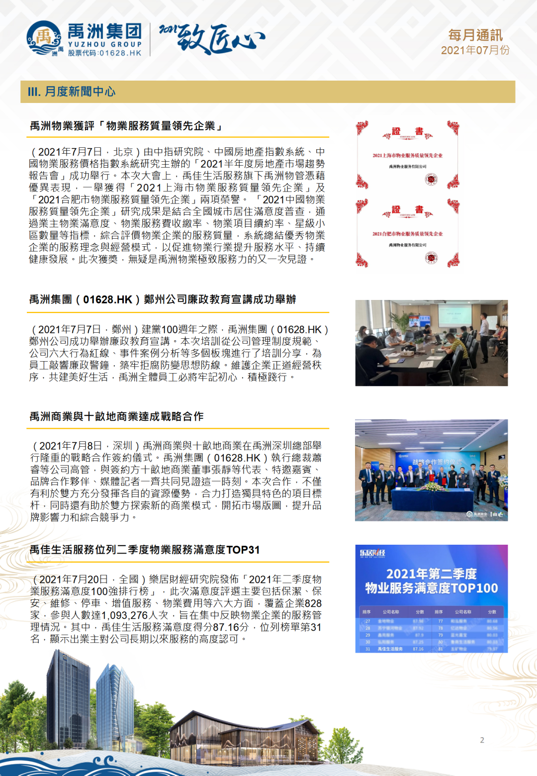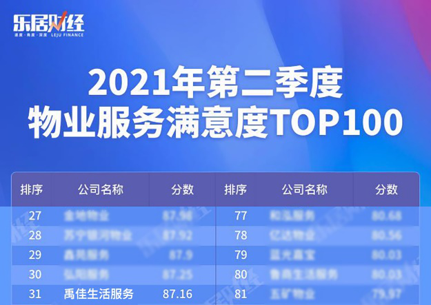 7月20日,樂居財(cái)經(jīng)研究院發(fā)布“2021年二季度物業(yè)服務(wù)滿意度100強(qiáng)排行榜”。其中,禹佳生活服務(wù)滿意度得分87.16分,顯示出業(yè)主對公司長期以來服務(wù)的高度認(rèn)可。