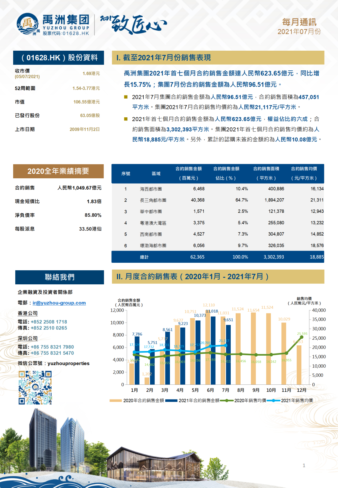 2021年7月,禹洲集團(tuán)實(shí)現(xiàn)合約銷售金額為人民幣96.51億元,合約銷售面積為457,051平方米,合約銷售均價約為人民幣21,117元/平方米。