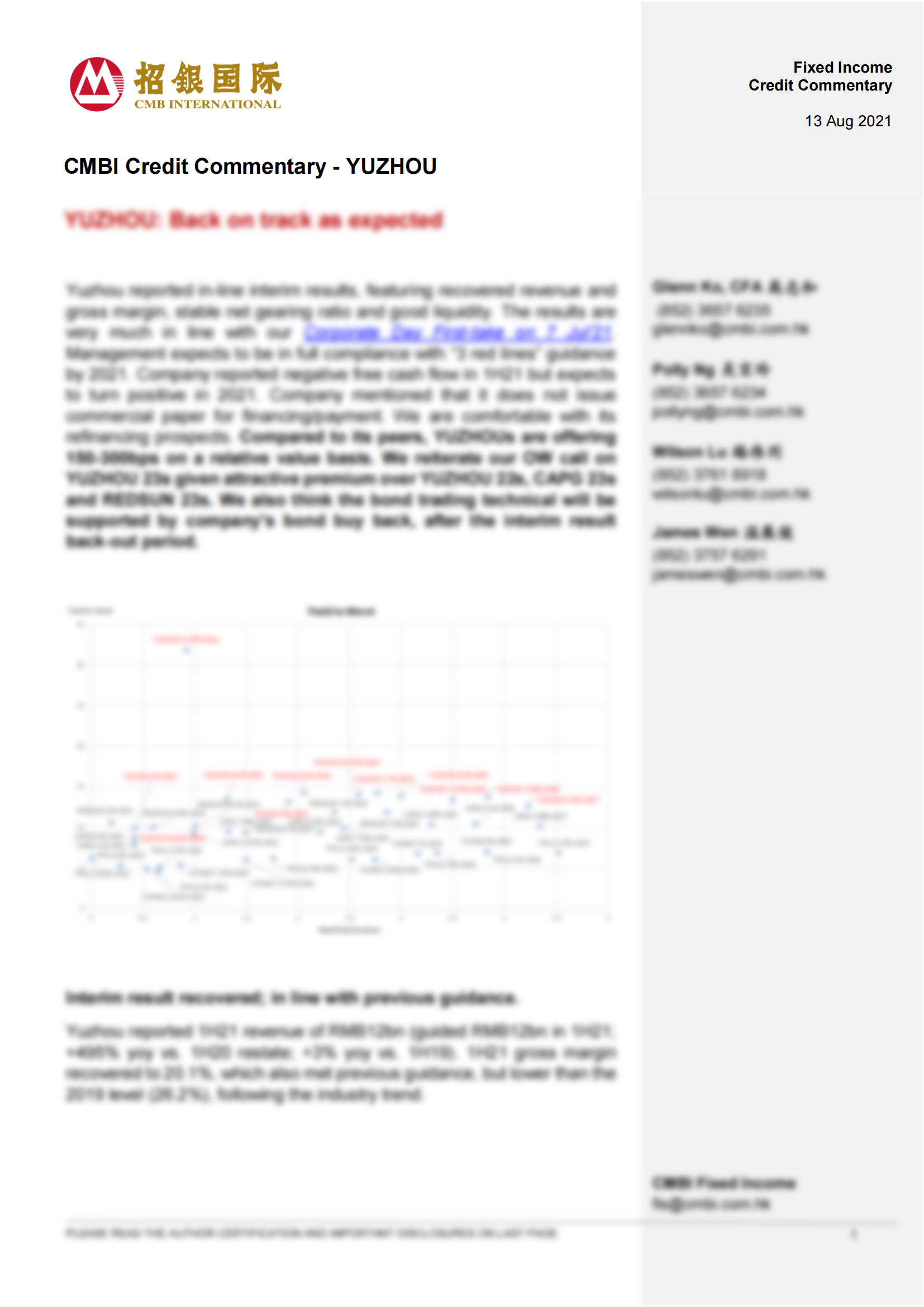 國際知名投行招銀國際近日發(fā)表固定收益研究報(bào)告指出,禹洲集團(tuán)(01628.HK)上周四公布2021年中期業(yè)績,收入及毛利率顯著回升,凈負(fù)債比率有所下降且流動(dòng)性良好。招銀國際認(rèn)為禹洲的中期業(yè)績符合該行于2021年7月7日首次覆蓋報(bào)告中的觀點(diǎn)。結(jié)合當(dāng)下行業(yè)背景,考慮到禹洲從未發(fā)行過商票,且非標(biāo)融資占比極低,招銀國際認(rèn)為禹洲中期業(yè)績符合預(yù)期,業(yè)績重回正軌,在公司回購債券予以支撐之下,市場(chǎng)態(tài)勢(shì)有望持續(xù)轉(zhuǎn)好,給予禹洲債券“優(yōu)于大市”評(píng)級(jí)。