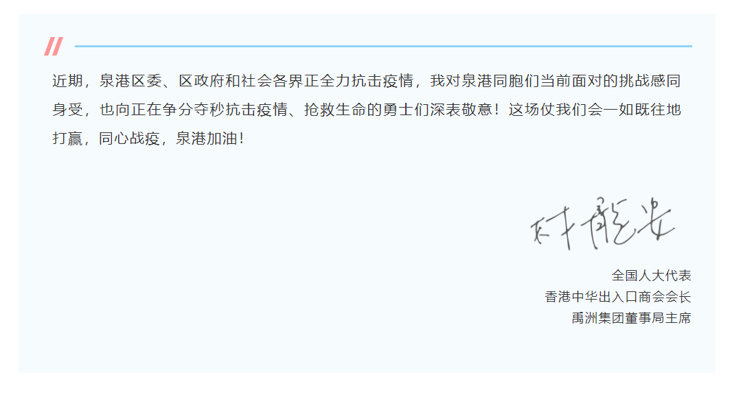 全國人大代表、香港中華出入口商會會長、禹洲集團董事局主席林龍安先生,祖籍福建省泉州市泉港區(qū),當他聽到家鄉(xiāng)泉州暴發(fā)疫情的消息后,第一時間響應(yīng)號召,代表禹洲集團通過禹洲公益基金會向泉州市泉港區(qū)紅十字會捐款50萬元,支援疫情防控工作。