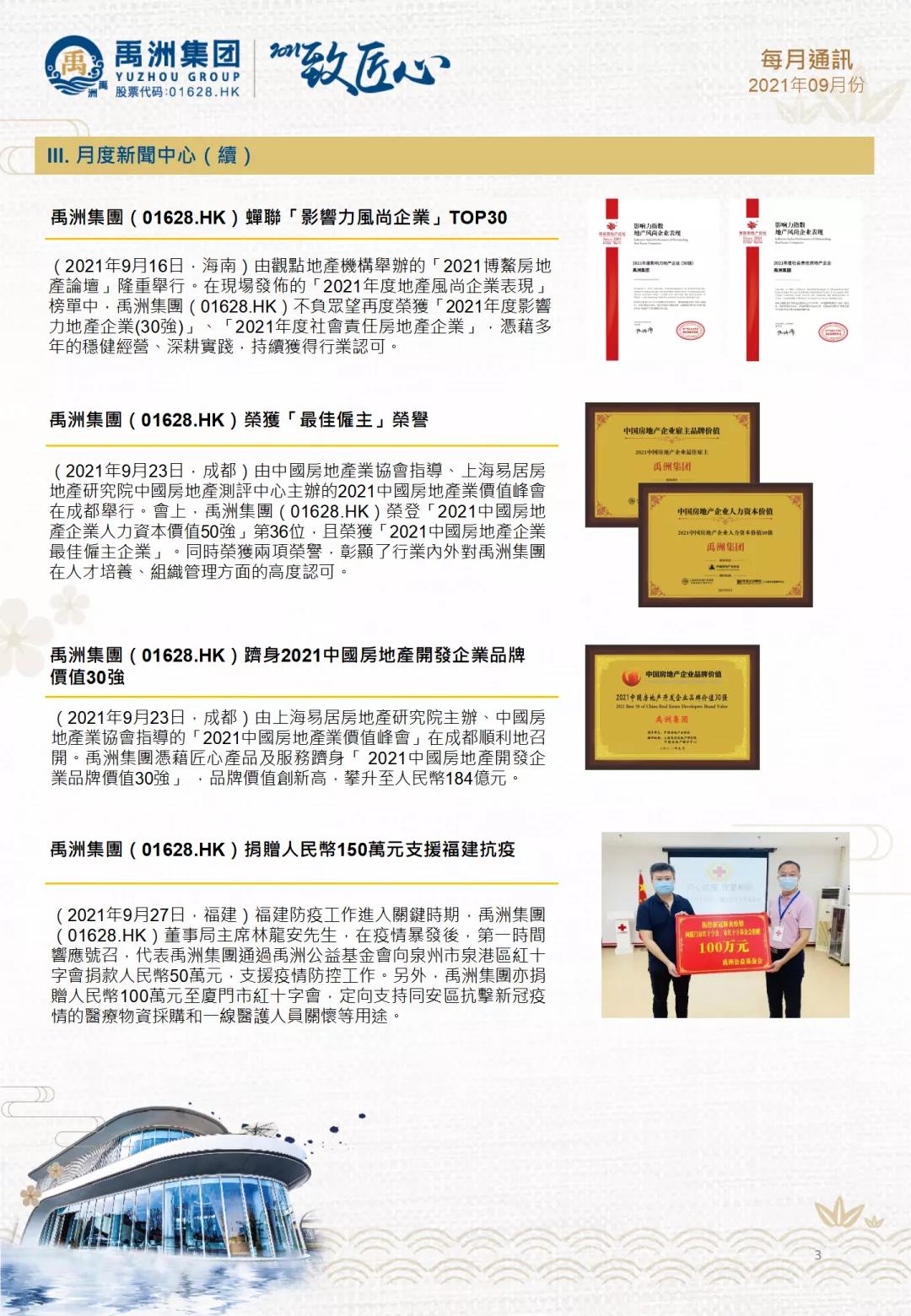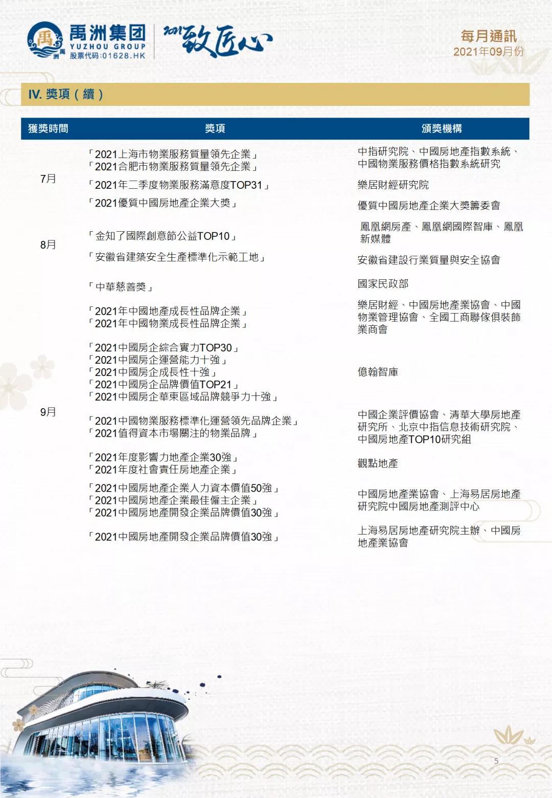 9月10日,禹洲集團及旗下禹洲物業(yè)榮獲樂居財經(jīng)年度論壇雙料品牌大獎,禹洲集團獲得“2021年中國地產(chǎn)成長性品牌企業(yè)”、禹洲物業(yè)獲得“2021年中國物業(yè)成長性品牌企業(yè)”稱號,反映市場對禹洲業(yè)務可持續(xù)發(fā)展及成長的信心,在產(chǎn)品與服務齊頭并進,持續(xù)創(chuàng)造品牌價值。