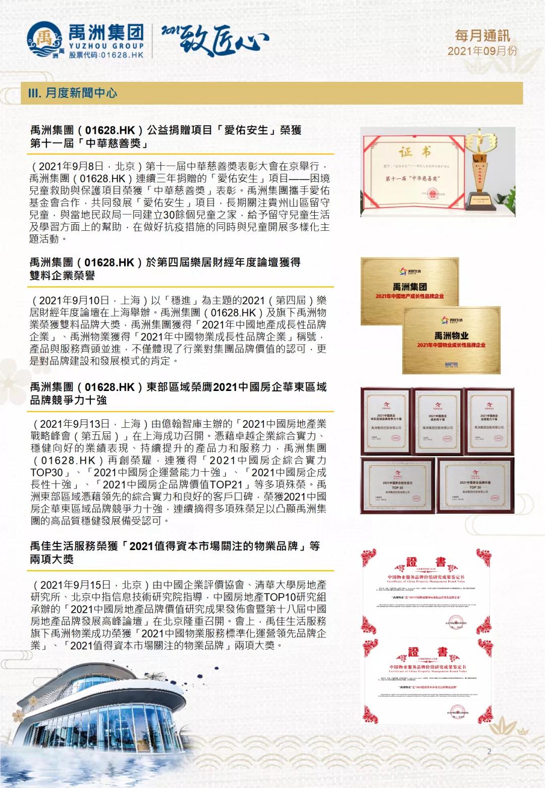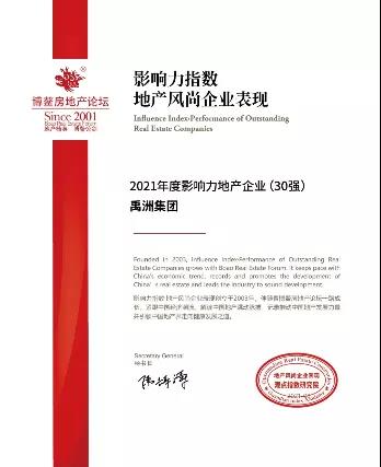 禹洲集團更于9月15日在“2021中國房地產(chǎn)品牌價值研究成果發(fā)布會暨第十八屆中國房地產(chǎn)品牌發(fā)展高峰論壇”上獲得 “2021中國物業(yè)服務標準化運營領(lǐng)先品牌企業(yè)”、 “2021值得資本市場關(guān)注的物業(yè)品牌”兩項大獎;于9月16日在“2021博鰲房地產(chǎn)論壇”中榮獲“2021年度影響力地產(chǎn)企業(yè)(30強)”、“2021年度社會責任房地產(chǎn)企業(yè)”,再次力證集團領(lǐng)先的綜合實力和競爭力。