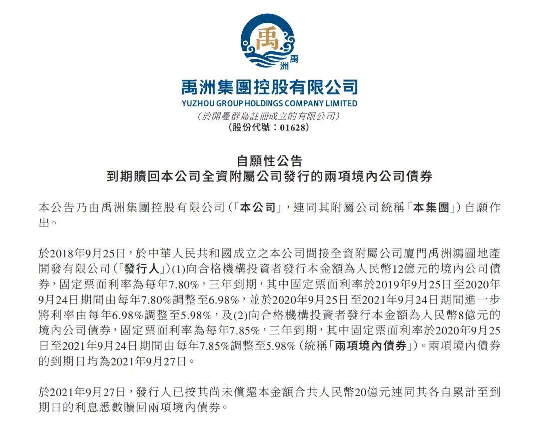 9月27日,禹洲集團如期贖回共人民幣20億元全資附屬公司廈門禹洲鴻圖發(fā)行的兩項境內(nèi)公司債券,除此之外,公司亦于8月30日如期償還人民幣10億元境內(nèi)公司債券。截至目前,禹洲集團已悉數(shù)償還年內(nèi)到期的所有境內(nèi)公司債券,而境外債券方面,禹洲集團早于5月已悉數(shù)贖回年內(nèi)到期的所有境外債券,至此2021年內(nèi)到期的境內(nèi)外所有債券均已悉數(shù)償還。