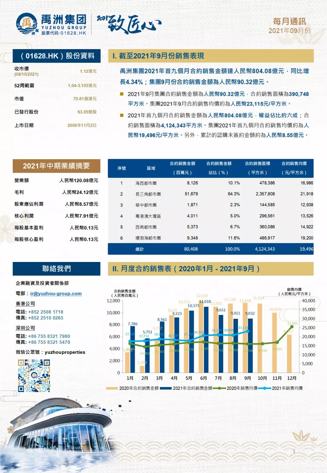 2021年9月,禹洲集團實現(xiàn)合約銷售金額為人民幣90.32億元,合約銷售面積為390,748平方米,合約銷售均價約為人民幣23,115元/平方米。
