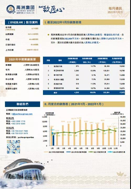 2022年1月,禹洲集團實現(xiàn)合約銷售金額達人民幣45.20億元,合約銷售面積為252,904平方米。合約銷售均價約為人民幣17,872元/平方米。另外,累計的認購未簽約金額約為人民幣3.37億元。
