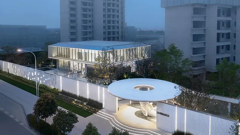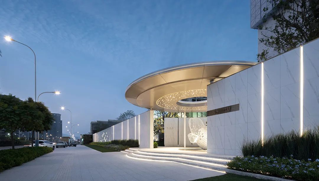 弧形臺(tái)階與門(mén)樓圓頂以繪畫(huà)般的弧度平行,登門(mén)而上,給予每個(gè)業(yè)主及來(lái)訪者如步入殿堂般的儀式感;而入門(mén)處水面的波光與門(mén)樓的燈光星星點(diǎn)點(diǎn)地交相輝映著,更有天光流瀉而下,聚氣于此,為人們創(chuàng)造出一片遠(yuǎn)離塵世的藝術(shù)場(chǎng)域。