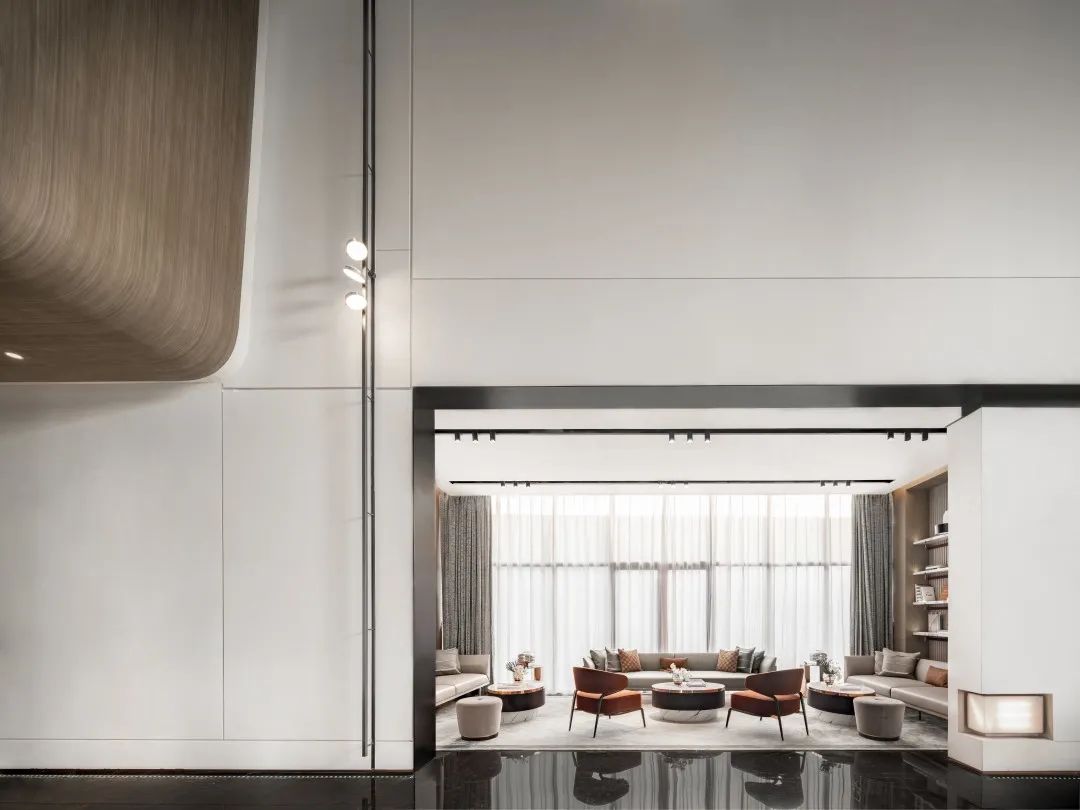 沙發(fā)與挑空的大廳之間構(gòu)筑出了通透的空間視野,色調(diào)柔順、舒適、自然。延續(xù)著云與水的韻味和優(yōu)雅精致的調(diào)性,也彰顯著和諧大氣、簡(jiǎn)約形意的空間氣質(zhì)。