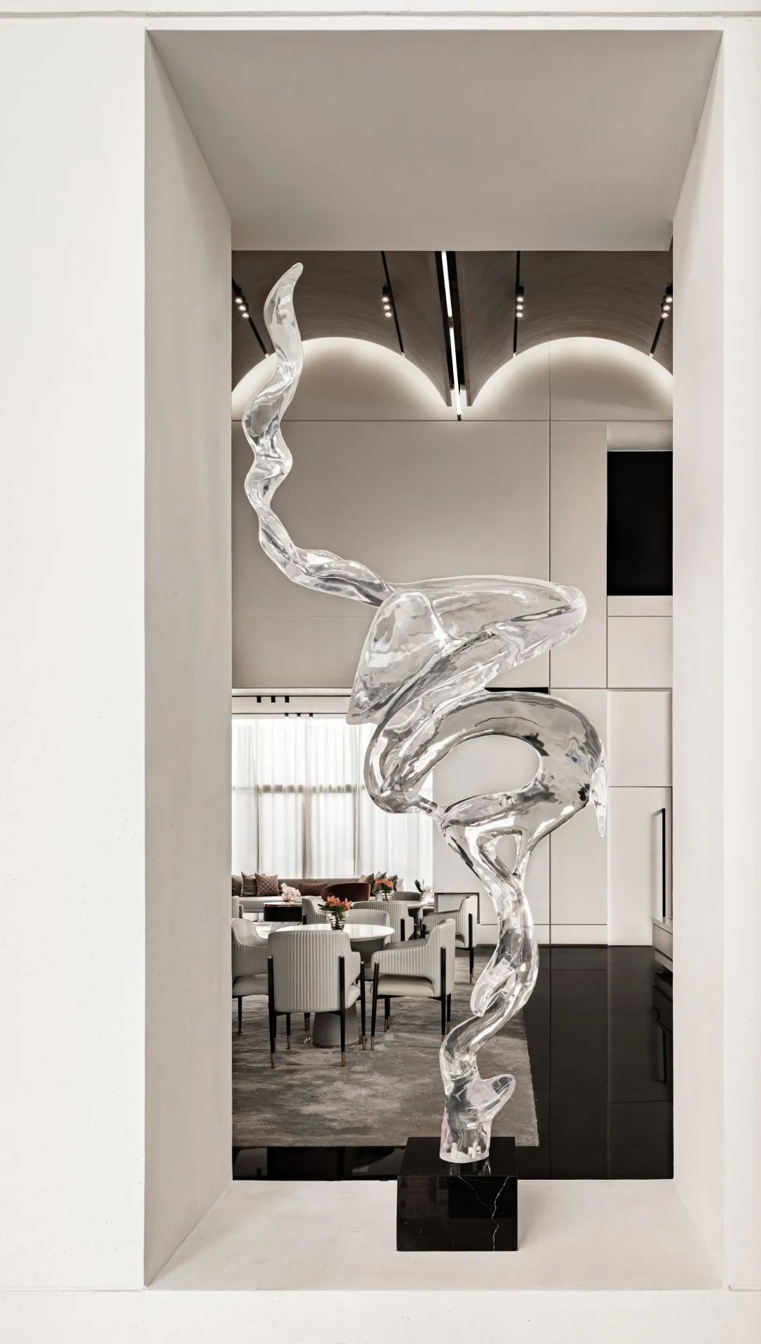 潺潺的溪泉以極優(yōu)美極寫(xiě)實(shí)的狀態(tài)被定格在了最優(yōu)雅的一瞬間,清水在其中流動(dòng),靈魂在其中交融。透過(guò)水流,洽談區(qū)呼之欲出,一個(gè)嶄新的藝術(shù)情境漸入佳境。