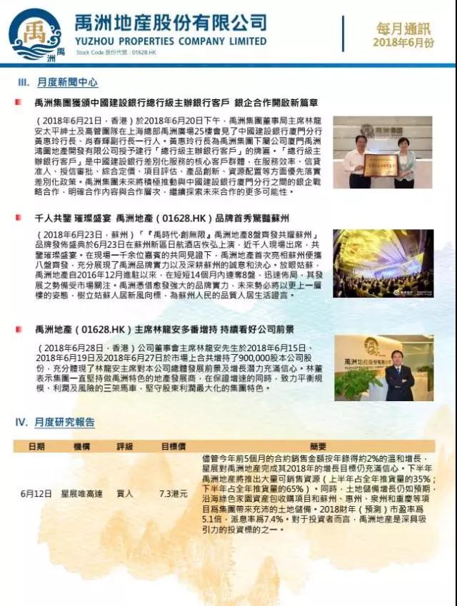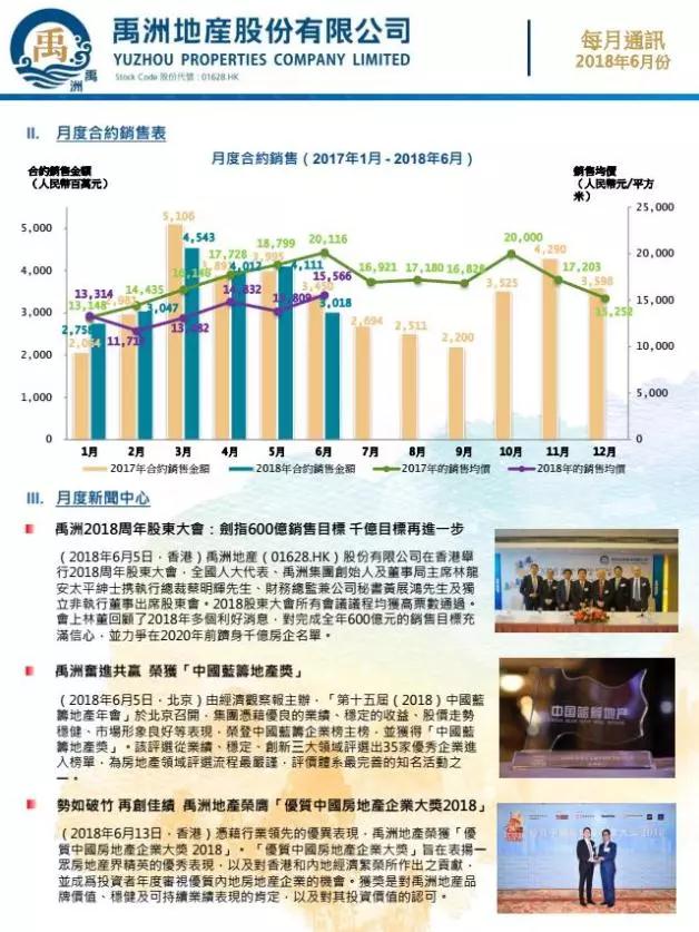 2018年6月集團合約銷售金額人民幣30.18億元;合約銷售面積為193,772平方米,同比上升13% 。集團2018年6月合約銷售均價約人民幣15,566元/平方米。