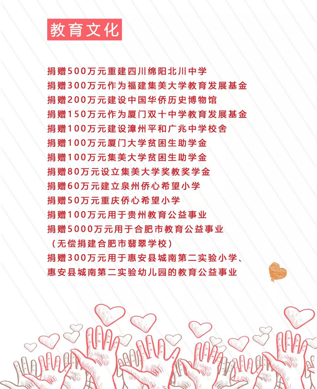 此外,2008年汶川地震、2010年南平水災(zāi)、2013年雅安地震等自然災(zāi)害發(fā)生時(shí),禹洲第一時(shí)間進(jìn)行響應(yīng),捐贈善款幫助災(zāi)區(qū)人民共度難關(guān)。全國人大代表、禹洲集團(tuán)董事局主席林龍安太平紳士更是不顧余震的危險(xiǎn),親自前往災(zāi)區(qū)參與賑災(zāi)。