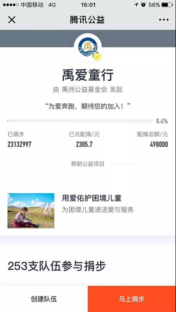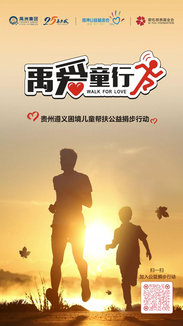 4月22日, "禹愛(ài)童行--貴州遵義困境兒童幫扶公益捐步行動(dòng)"在騰訊公益平臺(tái)正式上線,旨在倡導(dǎo)綠色+健康+公益的生活方式。活動(dòng)期間,每天運(yùn)動(dòng)步數(shù)滿1萬(wàn)步,即可在微信平臺(tái)進(jìn)行捐步。禹洲公益基金會(huì)將按照每1萬(wàn)步=1元的比例向"愛(ài)佑安生--困境兒童救助與保護(hù)"項(xiàng)目配捐善款,額滿為止。