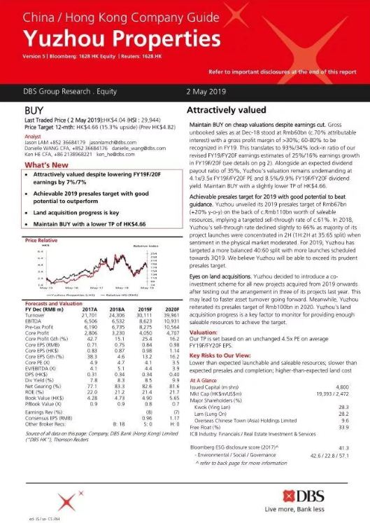 星展 | 禹洲地產(chǎn): 2019銷售目標(biāo)預(yù)期將超額完成 維持“買入"