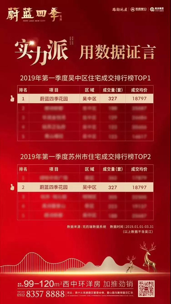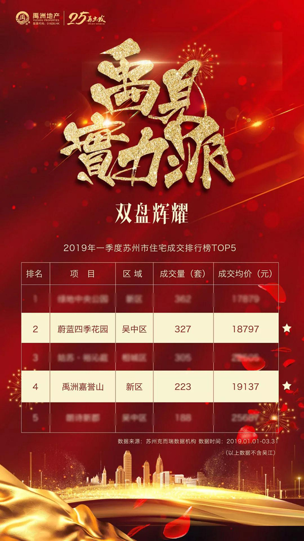 其中,禹洲繼續(xù)稱霸姑蘇城。在2019年一季度蘇州市住宅成交排行榜TOP5中,蔚藍(lán)四季花園和禹洲嘉譽(yù)山分別以327套和223套的優(yōu)異成績共同上榜,被譽(yù)為姑蘇實(shí)力派紅盤。