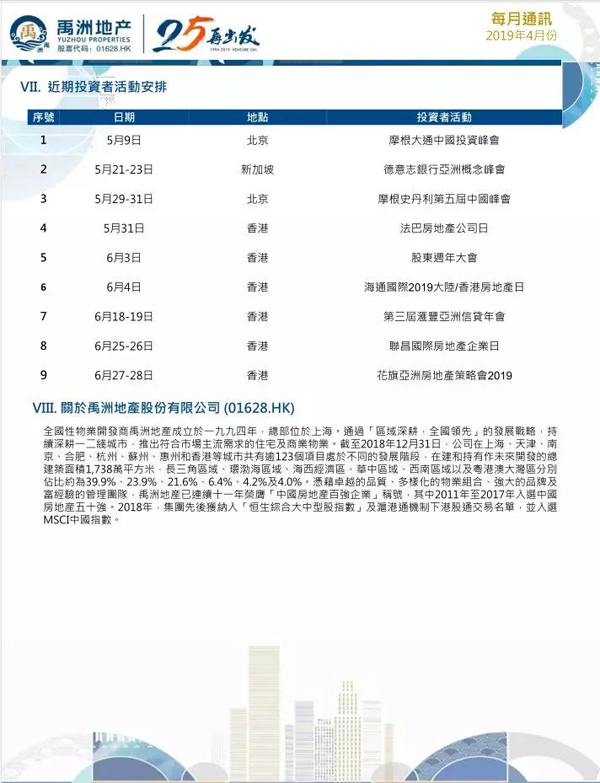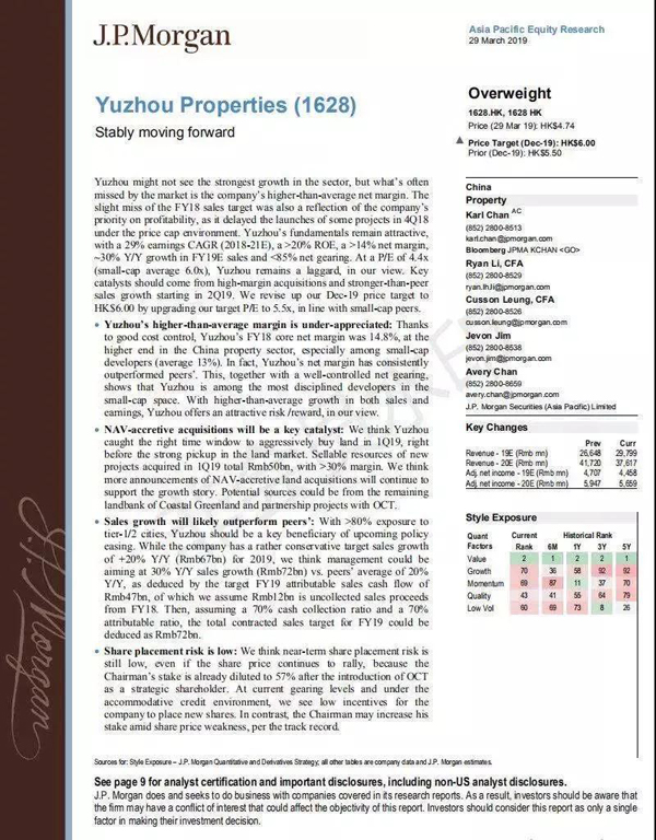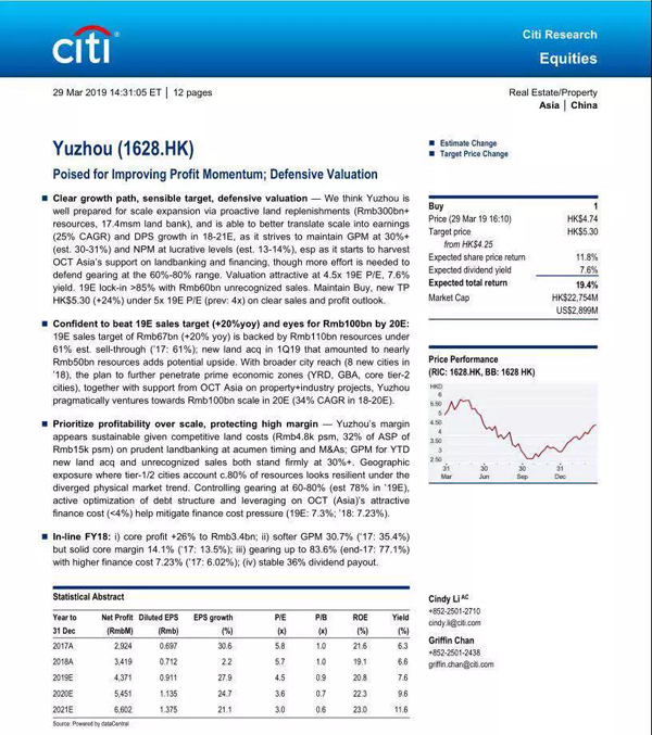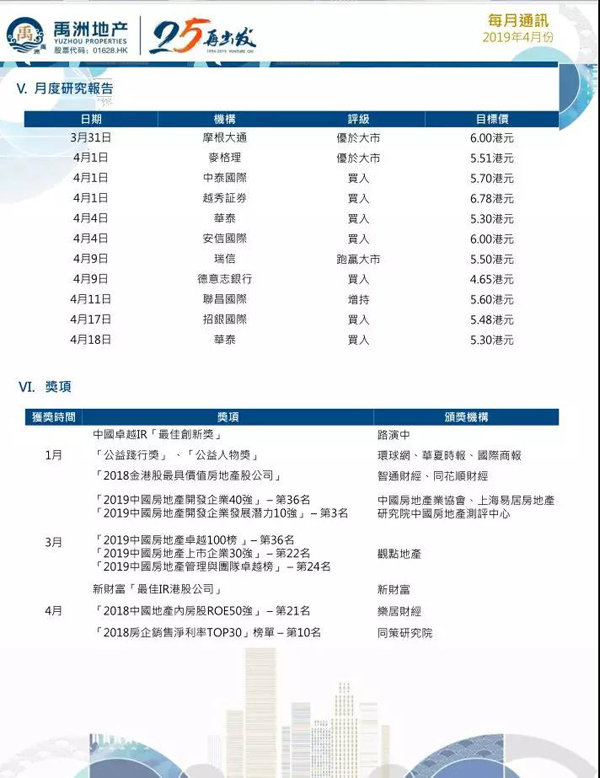 多家權(quán)威券商紛紛發(fā)布報(bào)告,看好公司未來發(fā)展。摩根大通認(rèn)為,禹洲地產(chǎn)優(yōu)于行業(yè)的利潤率受到廣泛認(rèn)可,高利潤率的新增優(yōu)質(zhì)地塊將會(huì)是關(guān)鍵,該行維持“優(yōu)于大市”評(píng)級(jí),目標(biāo)價(jià)上調(diào)至6港元,維持禹洲為其地產(chǎn)首選股?;ㄆ煺J(rèn)為,禹洲地產(chǎn)增長前景及目標(biāo)明確,防守穩(wěn)健;堅(jiān)持優(yōu)先考慮盈利能力,維持高利潤率,維持“買入”評(píng)級(jí),目標(biāo)價(jià)上調(diào)至5.3港元。聯(lián)昌國際認(rèn)為,禹洲注重規(guī)模與利潤平衡發(fā)展,未來發(fā)展值得期待,重申“增持”評(píng)級(jí),目標(biāo)價(jià)5.6港元。中金、華泰、海通國際、中泰國際、越秀證券、安信國際、瑞信、興業(yè)證券等多家券商也都看好禹洲,紛紛重申“買入”、“增持”、“優(yōu)于大市”評(píng)級(jí)。