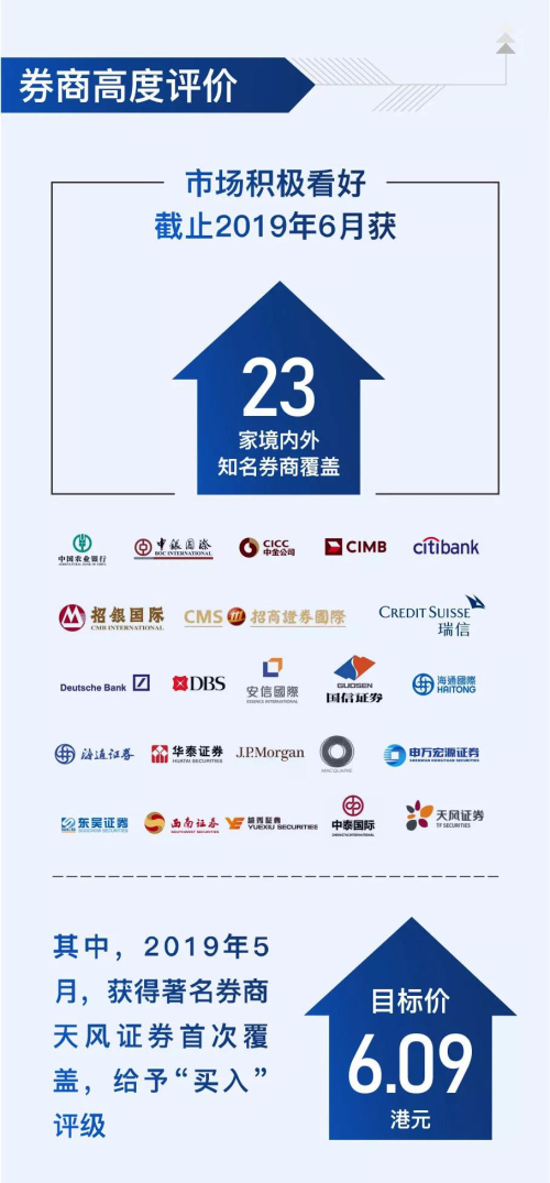 由于銷售表現(xiàn)亮眼,禹洲地產(chǎn)屢獲獎(jiǎng)項(xiàng),受到大行及券商的積極評(píng)價(jià)。截至2019年上半年,共有境內(nèi)外23家券商覆蓋,其中,天風(fēng)證券在今年首次覆蓋,予以“買入”評(píng)級(jí)與6.09港元的目標(biāo)價(jià)格。