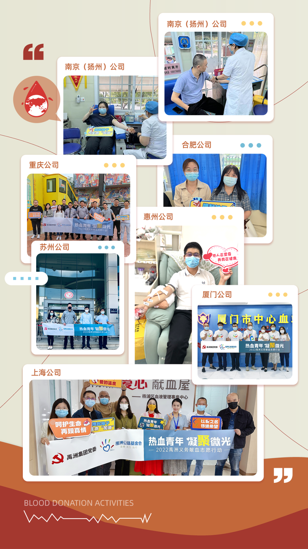 秉持“取之于社會(huì),獻(xiàn)之于社會(huì)”的公益理念,禹洲公益基金會(huì)聯(lián)合禹洲集團(tuán)黨委開展了以“熱血青年,凝聚微光”為主題的2022義務(wù)獻(xiàn)血志愿行動(dòng),踐行社會(huì)公民責(zé)任。上海、蘇州、廈門、重慶、南京、惠州、合肥等公司員工積極響應(yīng),爭(zhēng)當(dāng)獻(xiàn)血志愿者,以實(shí)際行動(dòng)展現(xiàn)了積極奮進(jìn)、敬業(yè)擔(dān)當(dāng)、無私奉獻(xiàn)的良好精神面貌。