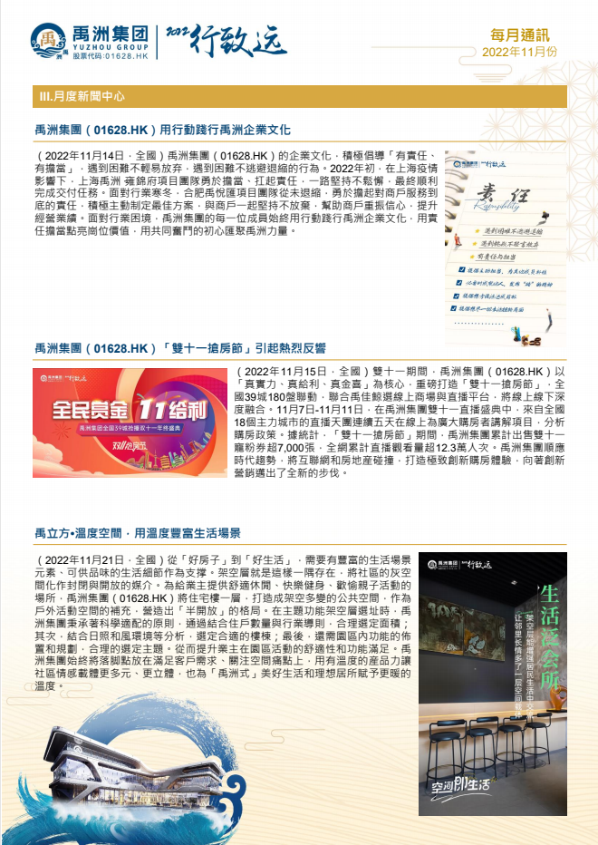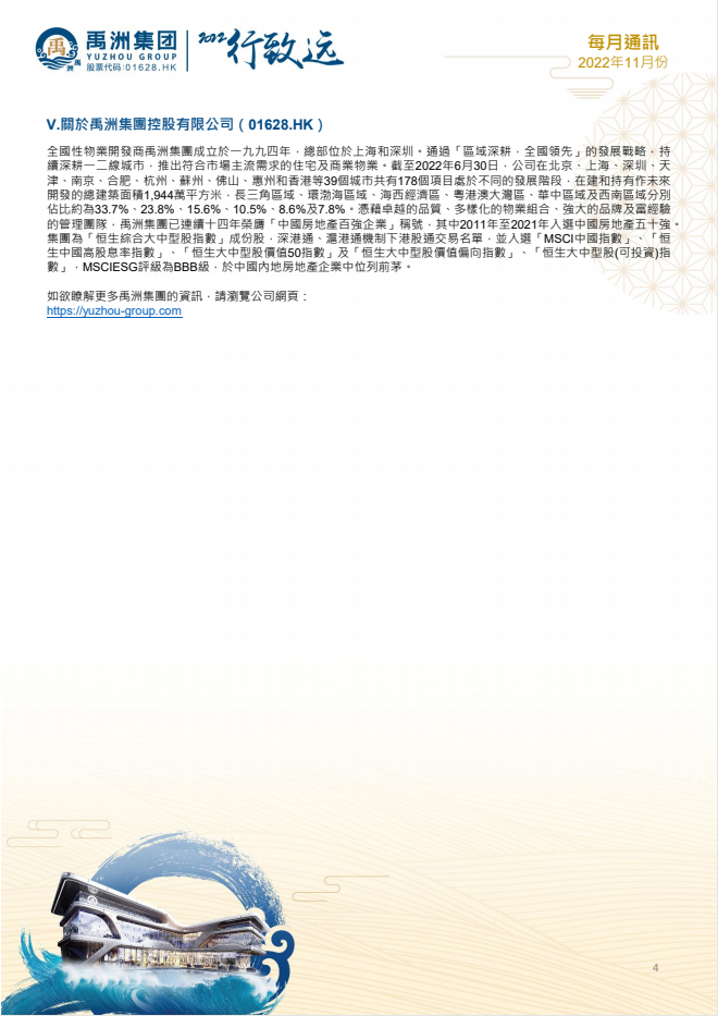 2022年前11個月,禹洲集團(tuán)實現(xiàn)累計銷售金額為人民幣338.03億元;累計銷售面積為1,914,551平方米;平均銷售價格為每平方米人民幣17,657元。另外,截至2022年11月30日,集團(tuán)累計的認(rèn)購未簽約金額約為人民幣4.11億元。