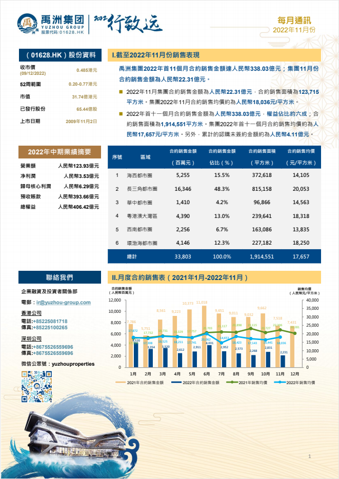 2022年11月,禹洲集團(tuán)實現(xiàn)合約銷售金額為人民幣22.31億元,合約銷售面積為123,715平方米,合約銷售均價約為人民幣18,036元/平方米。