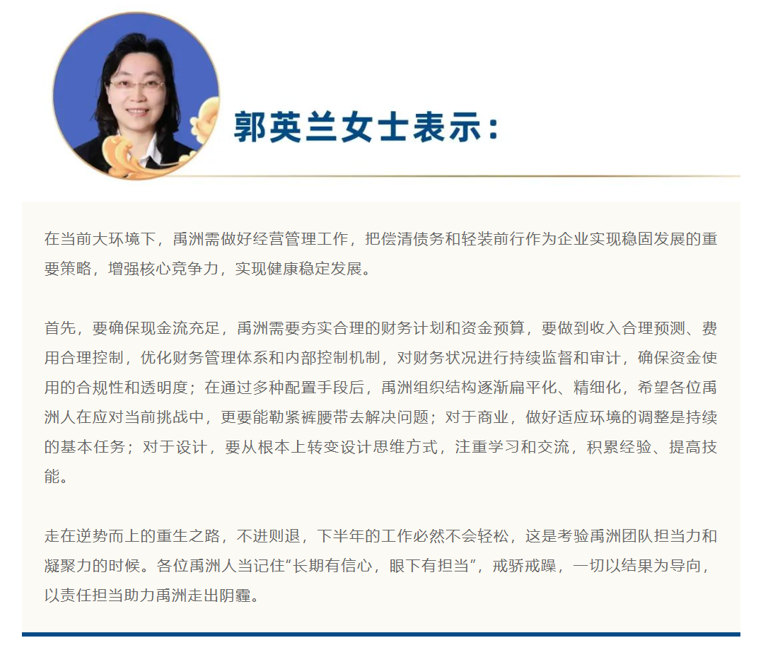 聚焦2023年下半年,全體禹洲同仁要在鑒往知來中提振信心,在砥礪前行中務(wù)求實(shí)效,厲兵秣馬、凝心聚力,前路注定崎嶇,我們想不被逆流沖垮,唯有迎難而上、不忘初心、奮楫篤行,方能在黎明到來之際續(xù)寫輝煌。