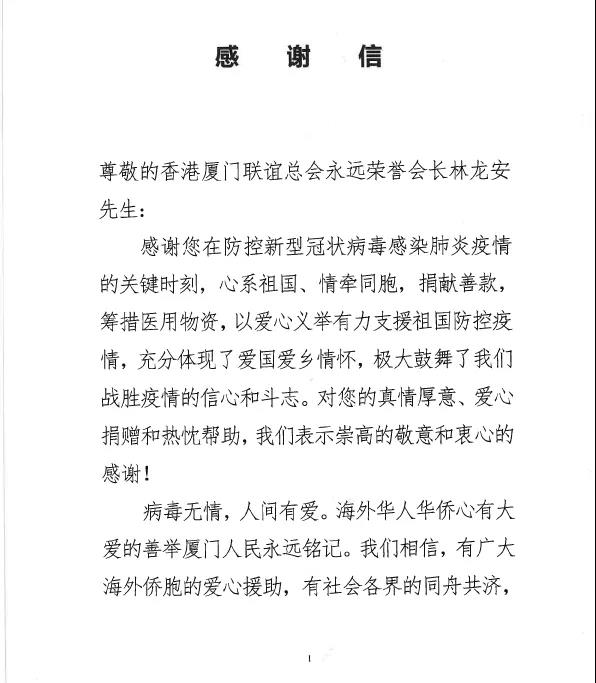 感謝信中提到,林龍安先生在此次疫情防治中心系祖國(guó)、情牽同胞,充分體現(xiàn)了愛(ài)國(guó)愛(ài)鄉(xiāng)情懷。