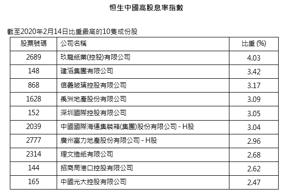 恒生中國(guó)高股息率指數(shù)旨在反映于香港上市而非賭場(chǎng)及博彩或煙草行業(yè)的高股息率內(nèi)地公司之整體表現(xiàn)。這項(xiàng)指數(shù)從符合行業(yè)資格的香港上市較大型公司中挑選出50只股息率最高的內(nèi)地證券,這些股票的價(jià)格波幅須要相對(duì)較低及于最近三個(gè)財(cái)政年度有持續(xù)派息紀(jì)錄。